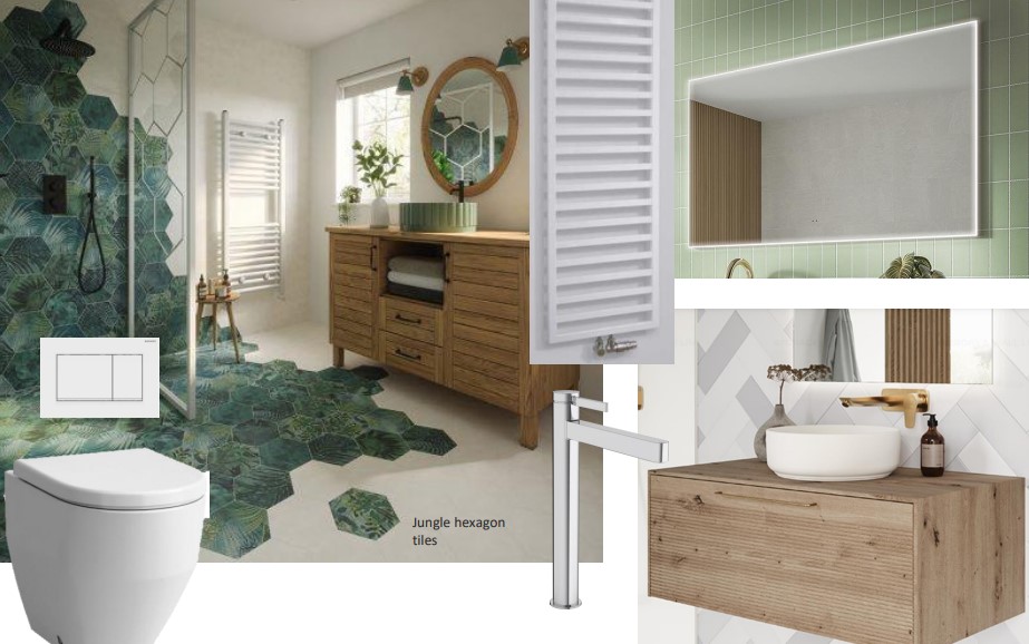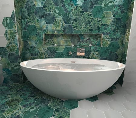 The Ca Pietra Jungle Hexagon was the perfect selection, the unique shape gave us the opportunity to ‘scatter’ the tiles across the floor and walls, mimicking twisting vines and the unpredictable nature of wild plants.